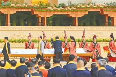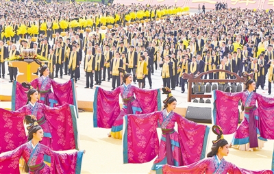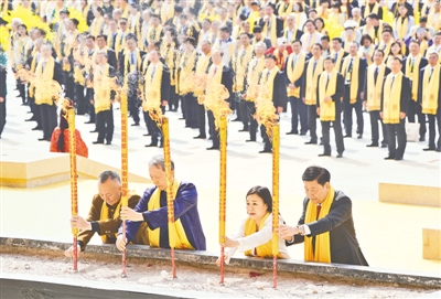 大典共有九項(xiàng)儀程,分別為:盛世禮炮、敬獻(xiàn)花籃、凈手上香、共拜始祖、恭讀拜文、高唱頌歌、樂(lè)舞敬拜、祈福中華、天地人和。