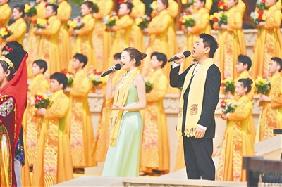 高唱頌歌。來(lái)自香港地區(qū)的鐘鎮(zhèn)濤、臺(tái)灣地區(qū)的朱孝天和澳門(mén)地區(qū)的麥嘉欣以及內(nèi)地的曹芙嘉,與56個(gè)民族的少年兒童一起,同歌《黃帝頌》,共聚家國(guó)情。
