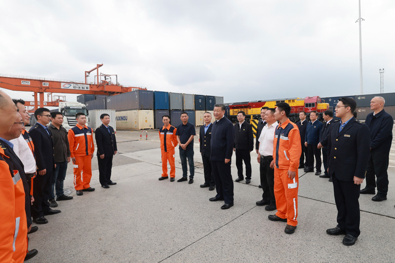 4月22日至24日,中共中央總書(shū)記、國(guó)家主席、中央軍委主席習(xí)近平在重慶考察。這是22日下午,習(xí)近平在重慶國(guó)際物流樞紐園區(qū)重慶鐵路集裝箱中心站,同貨車(chē)司機(jī)、列車(chē)司機(jī)、裝卸工人、場(chǎng)站管理人員等親切交流。新華社記者 王曄 攝