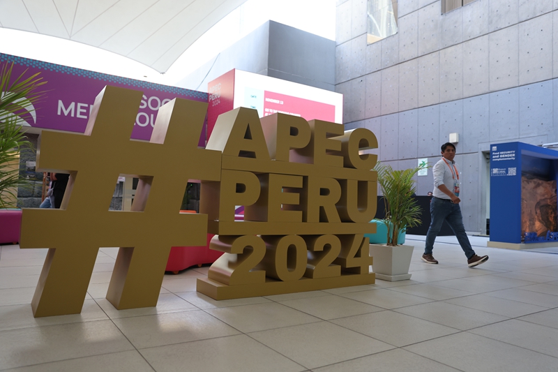 11月13日,人們從秘魯首都利馬會(huì)議中心外的2024年亞太經(jīng)濟(jì)合作組織(APEC)會(huì)議標(biāo)識(shí)前走過。新華社發(fā)(瑪麗安娜·巴索 攝)